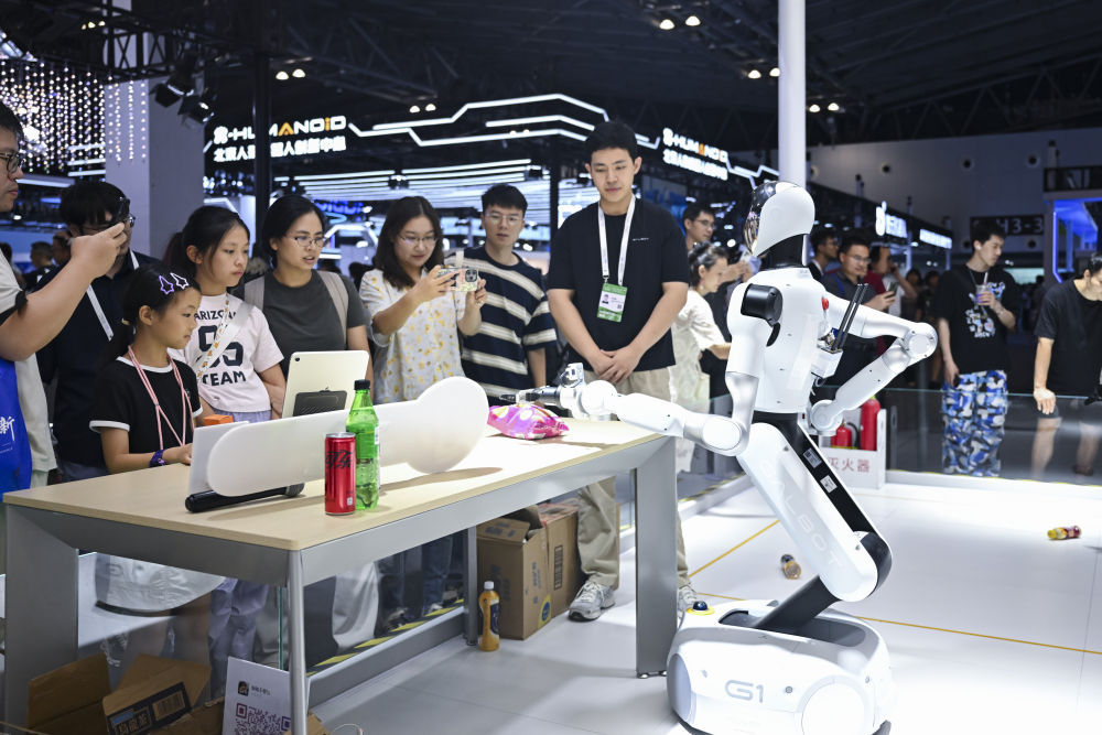 7月29日✿✿◈,上海2025世界人工智能大会✿✿◈,参观者在观赏一款可用于零售✿✿◈、工业等多种场景的机器人✿✿◈。新华社记者 陈浩明 摄