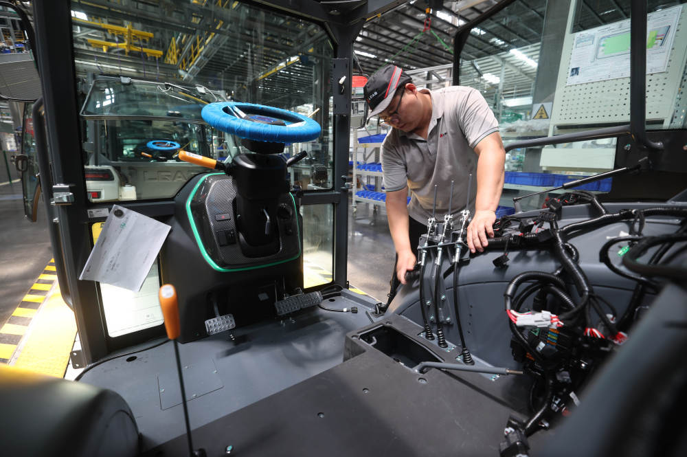 7月27日✿✿◈,工人在山东省临沂市兰山区临工智慧农机装备产业园的流水线上组装拖拉机✿✿◈。新华社发(王彦冰摄)